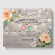 Modelos de Livro de Hóspedes de Casamento - Script Elegante com Rosas Brancas e Pêssego Florais e Luzes de Corda em Fundo de Madeira Rústica.