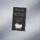 Um modelo de cartão de negócios magnético personalizado de restaurante com texto em script e um conjunto de talheres em um lindo guardanapo bordado em tons de cinza sobre preto, com letras em script brancas.