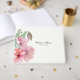 Bonito livro de hóspedes branco com trabalho de arte de água de papoilas cor-de-rosa. Personalize o texto preto para seu dia especial.