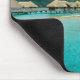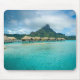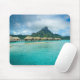 Mousepad com um recurso luxuoso do bungalow do telhado thatched do overwater em um recurso de férias na lagoa azul clara com uma vista na ilha tropical de Bora Bora, perto de Tahiti, em Polinésia francesa.