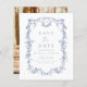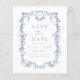 Anuncie seu dia especial com um floral inspirado na Vitoriana, salve a data em elegante azul empoeirado. Este design de inspiração francesa apresenta padrões florais complexos que evocam romance e sofisticação do eterno. A cor azul suave e poeirenta adiciona um toque sereno e refinado, perfeito para dar o tom de um casamento clássico e elegante. Ideal para casais que buscam um estilo gracioso, mas único, isto salva a data combina o charme de vintagem com a beleza moderna, garantindo que seus convidados antecipem uma celebração verdadeiramente especial.