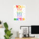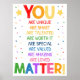 VOCÊ IMPORTA! Um poster excelente para ficar em um escritório de orientação escolar, terapeuta infantil ou psicólogo infantil para lembrar às crianças que elas importam! Um poster muito fofo para decorar a sala de aula ou o escritório! Possui cores brilhantes, divertidas e alegres.
