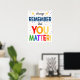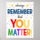 SEMPRE SE LEMBRA DE QUE VOCÊ IMPORTA! Um poster excelente para ficar em um escritório de orientação escolar, terapeuta infantil ou psicólogo infantil para lembrar às crianças que elas importam! Um poster muito fofo para decorar a sala de aula ou o escritório! Possui cores brilhantes, divertidas e alegres.