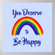 Levantem os espíritos das pessoas com esta afirmação positiva de autoestima. Excelente como presente ou para pendurar em casa ou no muro do escritório! Veja nossa coleção desses Impressões e Posters Inspiracionais Positivos. Este design inclui um arco-íris colorido brilhante e o texto "Você Merece Ser Feliz".