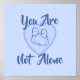 Avisem os outros que se importam com estas palavras de tranquilidade e apoio. Este é um presente maravilhoso para um amigo que passa por um período difícil ou que luta contra a depressão, ou um lembrete para si mesmo de que há pessoas que se importam. Veja nossa coleção desses Impressões e Posters Inspiracionais Positivos. Esta design inclui o desenho azul de duas pessoas juntas num coração e o texto "Você não está sozinho".