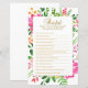 Este jogo "Bridal Do You Know" apresenta uma lista de coisas que só aqueles que realmente conhecem a noiva e o noivo podem responder. Veja quantos você sabe, e dê a si mesmo um ponto para cada palpite correto. Este jogo combina com outros jogos do mesmo design e pode ser comprado juntos para uma grande diversão de chá de panela!