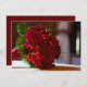 As características deste design uma foto de um buquê da rosa vermelha e da baga com suas hastes envolveram na fita vermelha. O buquê descansa em uma mesa, e você pode ver uma imagem macia de uma noiva no fundo. Este cartão é perfeito para pedir que seu amigo seja uma dama de honra, um florista ou uma madrinha de casamento. Personalize este cartão bonito com sua própria mensagem.
