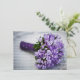 Este design apresenta uma foto de um buquê de tulipa de lavanda com seus caules embrulhados em fita roxa. O buquê repousa sobre uma cadeira branca mais dura. Este cartão é perfeito para pedir ao seu amigo para ser dama de honra, florista ou madrinha de casamento. Personalize este belo cartão com sua própria mensagem, se quiser.