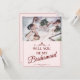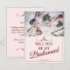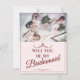 Você será minha dama de honra? Três madrinhas mentirosas com buquês em vestidos cor-de-rosa macio em frente a uma janela. O Backtext pode ser ajustado no modelo. Foto de Valerie Elash