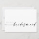 Esta design minimalista é perfeita para a noiva moderna! Apresentando um script de assinatura manuscrito emparelhado com uma fonte simples sans-serif. Personalize com a sua própria mensagem no verso ou ordene-a vazio e manuscreva a sua mensagem. Veja a loja para combinar cartões Maid/Matron of Honor!