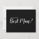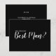 A Melhor Proposta de Homem apresenta o título "Will You Be My Best Man?" no estilo de letra branco do script moderno com detalhes na fonte branca do serif moderno em fundo preto.