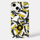 Esta capas de iphone temática de vôlei para raparigas apresenta volichões negros, dourados e brancos de dimensões variadas, dispostos de forma aleatória sobre um fundo branco personalizável — os painéis preto e dourado dos volleybolas são misturados com um padrão caleidoscópico floral para uma aparência esporosa e artística que ainda é esportiva - personalize seu monograma - por katz_d_zynes