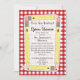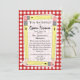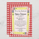 Um convite com um fundo de gingham vermelho na frente e atrás. A frente apresenta lápis amarelas dispostas em forma de retângulo com centro branco puro. Personalize com o nome do professor, a nota, a localização e a data das suas costas para a orientação da casa aberta da escola.