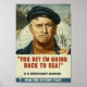 Esta é uma imagem de um poster de Propaganda da Guerra Mundial Vintage que mostra um Cão Velho do Mar Salgado carregando sua bolsa e dizendo "Você Aposto que vou voltar para o mar".