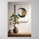 Poster de uma cena interior minimalista com um vaso cerâmico decorativo segurando uma planta pequena, elegantemente elegante, com folhas multicoloridas, colocada contra uma parede adornada com arte gráfica de formas crescentes. Luz natural suave melhora a atmosfera serena e moderna, destacando a mistura harmoniosa de arte e natureza.