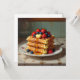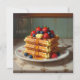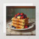 Cartão de saudação com tema de comida giro. Uma ilustração das waffles com morangos, amoras azuis, xarope e manteiga numa placa antiga bonito.