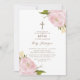 Convite para batismo elegante e feminino, com peões rosa pintados à mão e fundos de listras. Este convite de batismo floral personalizável, perfeito para eventos de primavera.