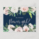 Peça aos seus amigos e familiares que façam parte do seu casamento com este cartão floral "Will You Be My Flower Girl", de cor aquática, com rosas brancas e cor-de-rosa e cravos com folhas verdes florestais e um roteiro caligráfico bonito, feminino e desenhado à mão.