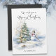 Bonito boneco de neve sorridente com pinheiro e árvore nua decorada.