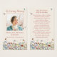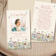 Esta é uma elegante e caprichosa carta de oração memorial. A design apresenta uma bela fonte de caligrafia e lindas flores silvestres em cor-de-rosa pastel, roxo, azul, amarelos e vermelhos ferozes ou terracota, além de borboletas delicadas. Este cartão de oração funerária pode ser facilmente personalizado com sua própria foto para criar um tributo especial para seu ente querido usando o modelo fornecido. Entre em contato com o designer para obter informações sobre este design ou sobre produtos correspondentes.