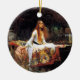 John William Waterhouse a senhora do ornamento de Shalott. Pintura a óleo em canvas desde 1888. A senhora de Shalott é uma pintura bonita do Pre-Raphaelite de uma cena do poema do senhor Tennyson de Alfred do mesmo nome. A pintura descreve a senhora condenada da navigação de Shalott para Camelot em um bote drapejado com uma tapeçaria que vermelha bonita teceu ao cair no amor com Lancelot. No barco sente três velas e um crucifixo de que a menina olha afastado. A senhora ela mesma é vestida em uma luz de fluxo - vestido medieval azul bordado com ouro. Seu cabelo é castanho-aloirado claro e guardara a corrente do barco enquanto pressiona longe da doca nos juncos e nas almofadas de lírio além. Um grande presente para fãs de John William Waterhouse, dos Pre-Raphaelites, da pintura inglesa romântica, e da legenda Arthurian.