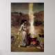 John William Waterhouse, o poster do Círculo Mágico. Pintura a óleo na canvas de 1886. O pintor de Pré-Raphaelite John Waterhouse recorreu regularmente a temas literários e mitológicos. O Círculo Mágico continua o fascínio do artista pelo sobrenatural, representando uma feiticeira com cabelo escuro desenhando um círculo mágico na terra com uma varinha. Vestindo um vestido azul decorado com figuras persas, ela fica ao lado de um caldeirão fumando sobre as bordas laranja e vermelha de um fogo brilhante. Ravens negros ficam perto observando o ritual se desdobrar. Um presente de excelente para fãs de J.W. Waterhouse, os Pré-Raphaelites, magia, feitiçaria e pintura romântica inglesa.
