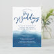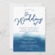 Convite de casamento de onda aquática azul com "o Casamento de" em uma letra de roteiro.