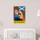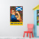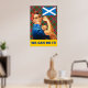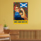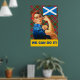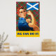 A humorous poster for supporters of independence for Scotland from the UK Westminster Government. The vintage illustration shows retro housewife Rosie in blue work shirt with sleeves rolled up and flexing her muscles. She wears a Forties style red and yellow polka dot scarf and a Yes badge on her shirt collar. The slogan reads We Can Do It! in blue lettering on a yellow border. Above the strong woman is a graphic of the Scottish flag. The background is a red, yellow, blue and green tartan plaid pattern.
