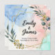 A sleek and artistic wedding invitation featuring an abstract watercolor background in soft blue, blush pink, and mint tones. The design is enhanced with a geometric gold foil frame and modern botanical illustrations, creating a luxurious and stylish look. The couple's names are highlighted in bold, elegant script, complemented by minimal sans-serif fonts for the details. Perfect for a contemporary, stylish wedding that values artistic expression and modern aesthetics.