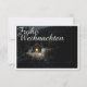 Die Karte zeigt eine stimungsvolle, winterliche Szenerie mit einer kleinen, beleuchteten Holzhütte inmitten eines verschneiten Waldes. Die warme Lichtquelle im Inneren schafft einen schönen Kontrast zur dunklen, friedlichen Umgebung. Der elegante "Feliz Natal"-Schriftzug em Weiß verleiht dem Motive eine festliche Nota. 🎄 ✨ Deutsch