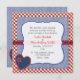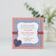 Convite de casamento do tema divertido ocidental feito em gráficos vermelhos, brancos e azuis. Uma aparência em camadas de um padrão vermelho e branco marcado, um denim azul e uma fita azul e vermelha, com um quadrado de texto branco como a camada superior. Gráficos de um coração comum de denim azul e vermelho no canto inferior esquerdo. Todo texto é personalizável e pronto para personalizar para o seu casamento do tema ocidental. Produtos de casamento correspondentes disponíveis.