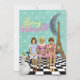 Whimsical, divertida e divertida... um pedido de "Seja minha madrinha" que é tão único quanto a noiva. Possui vários elementos peculiares, incluindo raparigas escolares vintage num banco, um pato coroa e uma lua crescente com a Torre Eiffel.