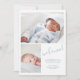 Este lindo anúncio de nascimento de um bebê na moda tem um lugar para duas fotos de seu bebê, mais a palavra "bem-vindo" na tipografia química. Adicione o nome e as informações do seu bebê à frente. A parte traseira apresenta uma cor azul macia com bolinhas brancas.