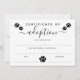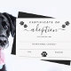 Certificado de adoção de animais de companhia bonito, branco, com detalhes em preto. Certificado de adoção preto-e-branco impresso com estampas de pata bonitinhas com pequenos corações. Certificado branco e preto de adoção de animais de companhia com fontes e patas bonitas.