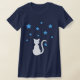 Um gato branco de neve com uma estrela azul gelada pendurada na cauda. Um céu estrelado de estrelas correspondentes está na frente e atrás.