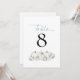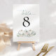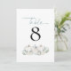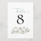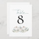 White Pumpkins Florals Número da Mesa de Casamento Teal. Pastel clors para o seu casamento outono com três abóboras brancas e florais com folhagem lacrimogênea sob o número da mesa que você pode personalizar facilmente. A mesa está no topo de um roteiro elegante. O mesmo design está do outro lado.