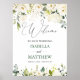 Este design apresenta uma ilustração de rosas brancas com folhagem vibrante colorida no estilo aquarela.
