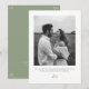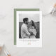 This chic white and sage green wedding save the date card features lovely blush pink watercolor floral accents, couple photo and contemporary set of fonts. The design is a fresh and modern take on the classic wedding save the date. The typographical elements at the back draws attention to the date.