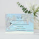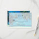Um cartão RSVP de casamento com uma foto temática tropical apresentando palmas de coco que se estendem através de uma praia branca arenosa isolada. Águas turquesas e um céu azul azul de azure no fundo.