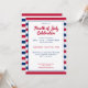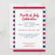 Convite moderno para comemoração de 4 de julho. Personalize este modelo de convite de festas de 4 de julho para a celebração do dia da independência com amigos e familiares. Possui riscas e estrelas vermelho patrióticas, brancas e azuis.