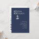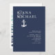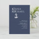 As peças desta elegante suíte de náuticas apresentam estilo náutico clássico com uma aparência limpa e minimalista. Ondas estilísticas em tons de aqua a azul marinho e uma ilustração de ancoragem e corda fornecem sotaques exclusivos. Um layout assimétrico em branco em azul-marinho, com os nomes da noiva e do noivo tendo precedência, dê a este convite de casamento uma surpreendente reviravolta moderna. Perfeito para casamentos de iates, barco, praia ou destino de verão. Procure ID836 para ver este conjunto completo e outros com sotaques de elementos marinhos alternativos.
