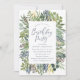 Convide amigos e família para a festa de aniversário em estilo com nossos incríveis convites de aniversário Wild Meadow. Os convites de aniversário na moda apresentam um quadro de folhagem de aquarela em tons de verde e azul marinho complementados por uma fonte de script que flui. Personalize os convites de bolsa mensageifesta de aniversario elegante adicionando os detalhes da sua festa e defina o tom para a sua festa!