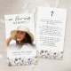Keep the memory of a loved one close with this personalized prayer card featuring a cherished photo, the sentiment IN LOVING MEMORY, name and dates accented with watercolor wildflowers on the front and an editable prayer accented with a simple gold cross and wildflowers on the back. It makes a meaningful keepsake to share at a funeral, memorial service or Celebration of Life and offers comfort and a lasting tribute for family and friends. Its small and portable size of 3.5x2" (wallet-sized) makes it convenient for loved ones to carry it with them as a reminder of your loved one’s life and spirit. Personalization makes each card unique.
