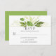 Moldura botânica de floresta RSVP. Um quadro superior de folhas, samambaias e gramíneas em tons de abacate, oliveira e primavera verde. A parte de trás da carta é uma sombra de primavera verde que corresponde às folhas da frente. Há convites de casamento correspondentes disponíveis.