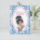 This cute card featuring a teenager holding a bouquet of flowers, on a plain white background. The back of