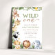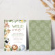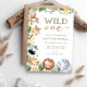 Convide convidados para comemorar o grande marco do seu filho selvagem com o nosso Convite Safari Primeiro Aniversário. Design de aquarela com adoráveis bebês e folhagem na selva.