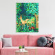 Canvas de um veado da tapeçaria William Morris num cenário de floresta de fantasia - veado bronzeado num fundo azul, profundo e verde de folhas e flores, acentuado com tulipas vermelhas