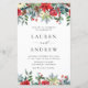 Convide convidados com este convite de casamento personalizável. Apresenta terras aquosas de flores de poinsettia, rosas de marfim e vermelhos, e amoras-framboesas com acentos de folhagem. Personalize adicionando nomes, datas, horários e outros detalhes. Este convite floral é perfeito para casamentos no inverno. Itens correspondentes estão disponíveis.