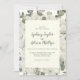 Este floral de inverno no convite casual de marfim é perfeito para um casamento elegante. O simples design apresenta flores brancas com verde-inverno e folhas de eucalipto, com um sentimento moderno do país.