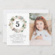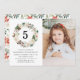 Convite de aniversário floral de inverno elegante, com a idade da criança rodeada por uma coroa de flores de marfim, bagas sagradas, cones de pínus e folhas verdes e peludas. Personalize os convites de aniversário de inverno adicionando o nome, a foto e os detalhes da festa da aniversariante. O reverso dos convites apresenta um padrão floral de inverno correspondente com belas poinsettias de aquarelas.